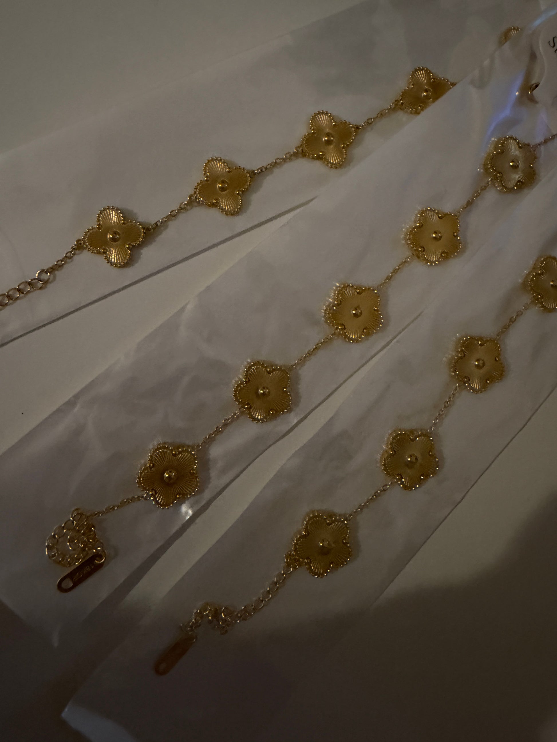 This elegant 18k gold clover bracelet combines timeless design with exceptional durability. Crafted from genuine 18k gold, it resists tarnishing and maintains its lustrous finish through years of wear. The delicate clover motif adds a touch of sophistication to any wrist, while the premium gold composition ensures lasting beauty without the need for constant polishing. A refined piece that transcends trends and becomes a cherished staple in your jewellery collection.